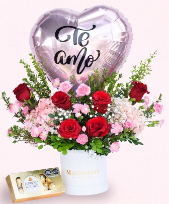 CON ROSAS , CLAVELES , GLOBO CORAZON 19"TE AMO |